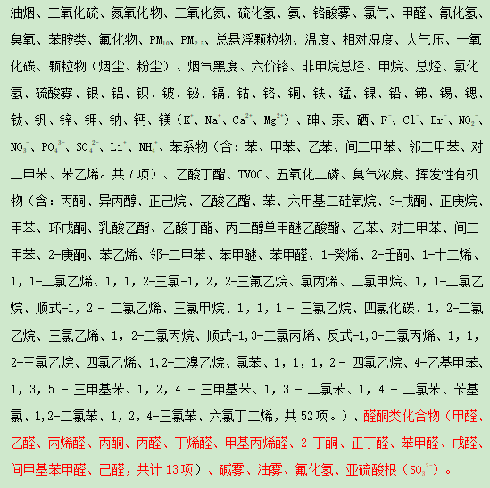 空氣溫度、相對濕度、室內風速、室內新風量、PM10、氨、二氧化硫、甲醛、二氧化氮、苯、甲苯、二甲苯、TVOC