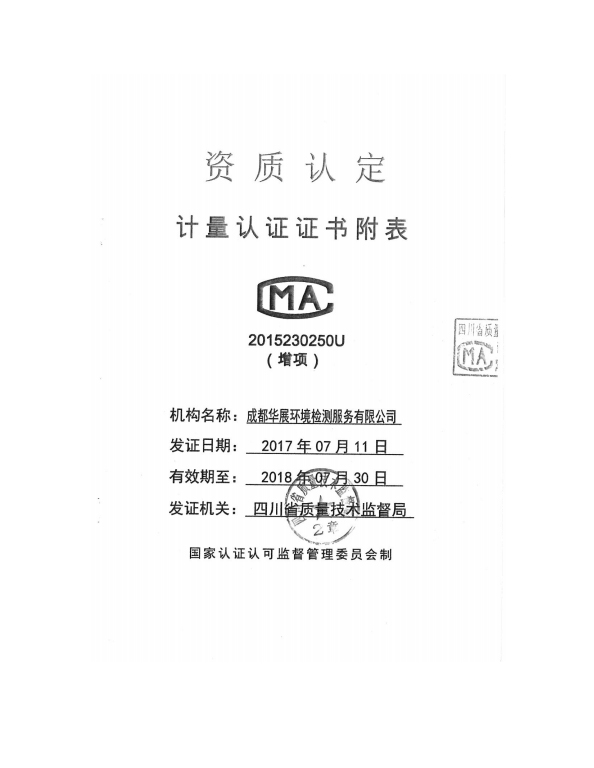 2017年7月11日,成都華展檢測服務(wù)有限公司收到了四川質(zhì)量技術(shù)監(jiān)督局頒發(fā)的檢測項目增項證書,標(biāo)志著成都華展的檢測能力又提升了,為拓展公司業(yè)務(wù)提供了保證。